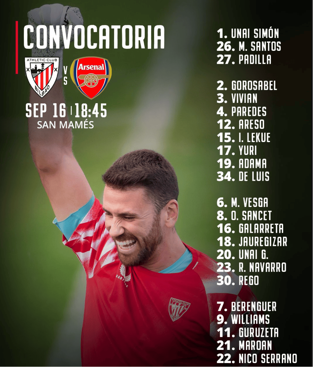 毕尔巴鄂竞技本赛季告别了36岁的德马科斯,他上赛季结束后宣布退役。替补门将阿吉雷萨巴拉租借给巴伦西亚,右后卫林孔租借给赫罗纳,上赛季从布拉加加盟的Alvaro Djalo租借给了赖扬加拉法。除了拉波尔特,毕尔巴鄂竞技另外两笔签约是马洛卡边锋纳瓦罗和奥萨苏纳右后卫阿雷索。毕尔巴鄂竞技本场缺少膝盖十字韧带断裂的中场贝尼亚特,他和中卫Unai Egiluz遭遇了同样的伤情。尼科威廉姆斯也不会出场,但拉波尔特是否会披挂上阵有待观察。毕尔巴鄂竞技主场对阵英格兰球队四胜三平两负。